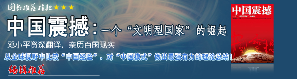本書提出,中國的崛起不是一個普通國家的崛起,而是一個五千年連綿不斷的偉大文明的復興,是一個“文明型國家”的崛起。“文明型國家”崛起的深度、廣度和力度都是人類歷史上前所未見的。這種“文明型國家”有能力汲取其他文明的一切長處而不失去自我,并對世界文明作出原創(chuàng)性的貢獻。 《中國震撼》是“中國模式”論的最堅實有力的理論著作,其歸納的“中國模式”的八大特點和八大理念,是“中國模式”論精辟的理論總結,它將豐富關于“中國模式”的理論研究,同時,也讓國人以及世人更客觀地認識中國崛起的事實,理解中國崛起背后的文化內涵。 |