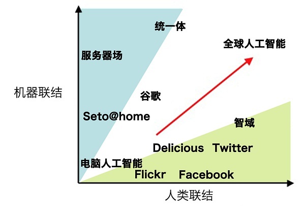 這個(gè)新的領(lǐng)域能被中央的這個(gè)箭頭很好的表示出來(lái),隨著機(jī)器聯(lián)結(jié)和人類(lèi)聯(lián)結(jié)區(qū)域的不斷增大,這兩個(gè)區(qū)域?qū)⒃谥虚g箭頭那塊相遇。這塊重疊交叉的區(qū)域?qū)?huì)被新興的全球超有機(jī)體所占據(jù)。這塊區(qū)域所代表的實(shí)體不單是由所有其他機(jī)器聯(lián)結(jié)起來(lái)而形成的統(tǒng)一體機(jī)器,也不完全是由所有人類(lèi)智能聯(lián)結(jié)成的超智能的智域(noosphere)。它是由所有人類(lèi)智能以及所有人工智能聯(lián)結(jié)在一起所形成的活躍的雜合體。它是一種泛智能。在這片結(jié)合區(qū)域內(nèi),所有產(chǎn)生信號(hào)的物體都是節(jié)點(diǎn)——不管是人類(lèi)還是機(jī)器。