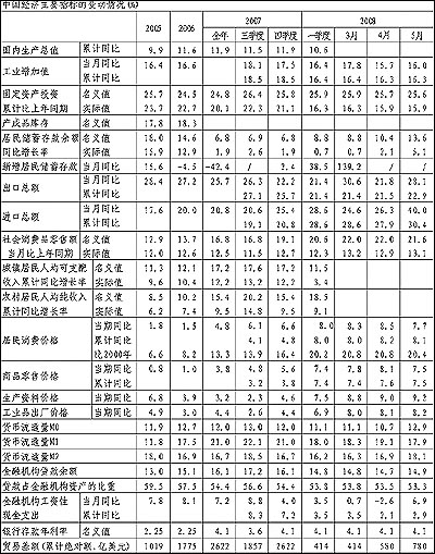 注:工業(yè)增加值的季度和月度數(shù)為國(guó)有工業(yè)和產(chǎn)值在500萬元以上的其他工業(yè)企業(yè);固定資產(chǎn)投資季度數(shù)和月度數(shù)的統(tǒng)計(jì)口徑為城鎮(zhèn)50萬元以上項(xiàng)目的投資;農(nóng)村居民收入的季度數(shù)為現(xiàn)金收入;部分當(dāng)月指標(biāo)為估算數(shù)。 | 5月份,我國(guó)經(jīng)濟(jì)總體狀況基本穩(wěn)定,居民消費(fèi)價(jià)格漲幅明顯回落,貨幣供應(yīng)量M1的增長(zhǎng)呈緩慢回落走勢(shì),但進(jìn)出口增長(zhǎng)速度明顯加快。有兩個(gè)因素對(duì)當(dāng)月經(jīng)濟(jì)狀況構(gòu)成了較大沖擊,一是汶川大地震對(duì)宏觀經(jīng)濟(jì)的影響;二是取消“五一”長(zhǎng)假的影響。必須考慮到這兩個(gè)因素的影響后才能作較為準(zhǔn)確的判斷。