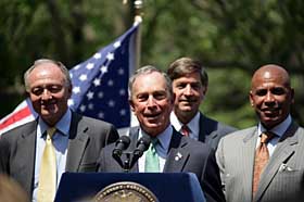 作為東道主,布隆伯格還向來(lái)賓介紹了紐約市的“綠色紐約”計(jì)劃。日前,布隆伯格提出了涉及10個(gè)領(lǐng)域的127項(xiàng)環(huán)保提案,其中包括對(duì)節(jié)能項(xiàng)目進(jìn)行支持、提高建筑物的環(huán)保標(biāo)準(zhǔn)、大力發(fā)展公共交通等,以期達(dá)到2030年全市減排30%溫室氣體的目標(biāo)。其中,爭(zhēng)議較大的是對(duì)進(jìn)入曼哈頓繁華地段車(chē)輛征收交通擁堵費(fèi)的提案。如這一提案獲紐約州議會(huì)通過(guò),紐約市將成為繼倫敦、新加坡、斯德哥爾摩之后采取此項(xiàng)措施的第四個(gè)大城市。