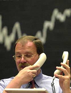 | 圖為一名交易商在法蘭克福股票交易所的DAX指數(shù)走勢圖前接電話。本報資料照片 | 德國股市關(guān)注中國概念股