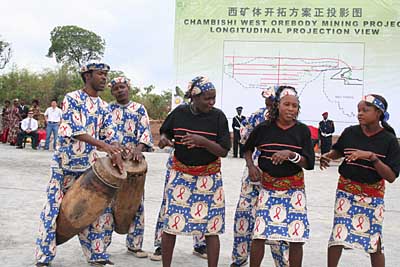 27日,在贊比亞謙比希銅礦,人們載歌載舞慶祝西礦體建設(shè)工程開工。當日,中國有色礦業(yè)集團中色非洲礦業(yè)公司在謙比希銅礦舉行西礦體建設(shè)開工儀式。該工程投資1億美元,工期3年。建成投產(chǎn)后,西礦體將年產(chǎn)銅礦石100萬噸,為當?shù)貏?chuàng)造1500個就業(yè)機會。