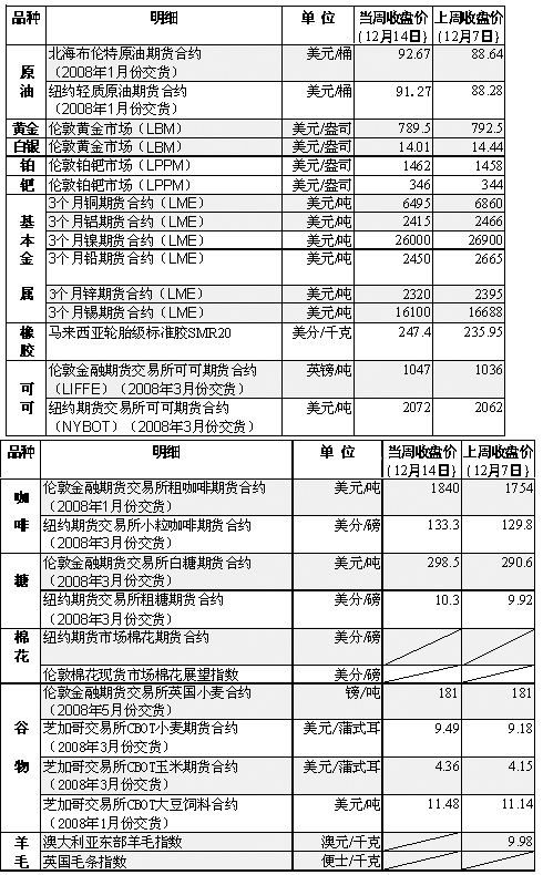 美國農(nóng)業(yè)部11日的報(bào)告稱,到本銷售年度結(jié)束時(shí)(明年5月31日),美國小麥庫存將僅為2.8億蒲式耳(762萬噸),為60年來最低。同為小麥出口大國的阿根廷和澳大利亞由于受到干旱天氣的影響,小麥產(chǎn)量和出口量也明顯減少。另一方面,消費(fèi)國則不斷向國際市場尋求購買小麥。 受美聯(lián)儲(chǔ)降息和美國原油庫存下降等因素影響,國際油價(jià)強(qiáng)勁反彈,之后由于美元走強(qiáng)以及投資者擔(dān)心原油需求將減少,紐約市場油價(jià)連續(xù)兩天走低,但仍收于每桶90美元上方。 美聯(lián)儲(chǔ)11日宣布,將聯(lián)邦基金利率下調(diào)0.25個(gè)百分點(diǎn)至4.25%,當(dāng)日國際油價(jià)重回每桶90美元上方。市場人士認(rèn)為,降息可以阻止美國經(jīng)濟(jì)陷入衰退并增加能源需求,同時(shí)可以使以美元計(jì)價(jià)的原油以及原油產(chǎn)品對持有其他貨幣的購買者更具吸引力。 受美元升值因素影響,黃金和白銀期貨價(jià)格均小幅回落,其中倫敦市場黃金期貨價(jià)格當(dāng)周收于每盎司789.5美元。數(shù)據(jù)顯示,美元對其他幾種主要貨幣的匯率14日升至7周以來最高點(diǎn)。市場人士認(rèn)為,美元升值使以美元計(jì)價(jià)的大宗商品對其他貨幣的持有者顯得“更加昂貴”。 由于市場對美國經(jīng)濟(jì)放緩的擔(dān)憂仍未消除,基本金屬價(jià)格繼續(xù)走低,倫敦市場銅期貨價(jià)已跌至每噸6495美元。 遭遇暴雨襲擊后,橡膠主產(chǎn)地——馬來西亞和泰國南部地區(qū)洪水泛濫,橡膠價(jià)格因供給趨緊而攀升。受主要出口國科特迪瓦爆發(fā)的大罷工影響,可可價(jià)格也反彈至7月來最高點(diǎn)。