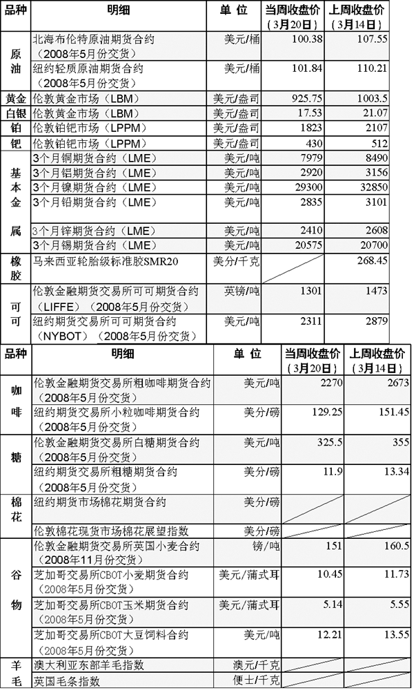 當(dāng)周大宗商品市場呈現(xiàn)戲劇性變化。周一(17日)、周二(18日)延續(xù)前幾周行情走勢,油價(jià)、金價(jià)均創(chuàng)歷史新高;但周三(19日)、周四(20日)各市場行情紛紛出現(xiàn)大逆轉(zhuǎn),其逆轉(zhuǎn)態(tài)勢同樣創(chuàng)出了多年來的單日或單周最大跌幅。周五(21日)為復(fù)活節(jié)假期,美國及歐洲金融市場均休市一天。 在原油市場,紐約原油期貨17日盤中創(chuàng)出每桶111.80美元的歷史新高。此后,受美國上周原油庫存增加以及美聯(lián)儲降息幅度不及部分市場人士預(yù)期等因素影響,19日原油期貨價(jià)格每桶急跌近5美元,創(chuàng)下17年來的最大單日跌幅;20日更是一度跌至100美元以下,收盤時(shí)回漲至每桶101.84美元。 在黃金市場,繼前一周突破每盎司1000美元大關(guān)后,17日紐約市場黃金價(jià)格再次創(chuàng)下每盎司1033.9美元的歷史最高紀(jì)錄(當(dāng)日收盤于1002.60美元)。不過,19日金價(jià)卻比前一個(gè)交易日每盎司直線下跌60.80美元,收于943.50美元,單日跌幅達(dá)6.1%。20日繼續(xù)下跌,收于每盎司920美元,一周內(nèi)金價(jià)共下跌8%,為1990年8月份以來的單周最大跌幅。分析師杰姆斯·摩爾指出,金價(jià)走低主要是受到美元匯率回升的影響。由于美聯(lián)儲降息幅度不及投資者預(yù)期,美元匯率受到一定支撐,這削弱了黃金作為避險(xiǎn)保值工具的吸引力,造成金價(jià)大幅下跌。 白銀、銅等金屬價(jià)格當(dāng)周走勢與黃金類似。其中,白銀、銅的價(jià)格一周跌幅分別達(dá)到18%和6.6%。類似的回調(diào)行情同樣發(fā)生在小麥、大豆等谷物期貨市場上。 分析人士稱,商品期貨價(jià)格的大幅跳水反映出市場對美國經(jīng)濟(jì)衰退的擔(dān)憂在日益加劇。最近幾周來,次貸危機(jī)對美國實(shí)體經(jīng)濟(jì)的真正影響開始顯現(xiàn),并逐步體現(xiàn)為市場對原材料的需求減少。而美國經(jīng)濟(jì)對能源、金屬、農(nóng)產(chǎn)品等原材料需求的下跌,必然在長期內(nèi)導(dǎo)致這些商品價(jià)格的下跌。