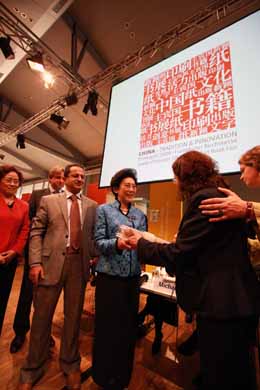 圖為19日,在德國法蘭克福會(huì)展中心,中國新聞出版總署副署長李東東(左四)從2008年法蘭克福書展主賓國土耳其主委會(huì)負(fù)責(zé)人穆埃海·薛科曼女士手中接過法蘭克福書展“主賓國卷軸”,這標(biāo)志著中國作為2009年法蘭克福書展主賓國活動(dòng)全面啟動(dòng)。新華社記者:羅歡歡 攝