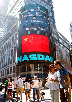 | 圖為2008年8月8日,在美國紐約時報廣場,納斯達克公司在其戶外大屏幕上打出慶祝北京奧運會開幕的畫面。新華社記者