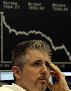 | 一名交易員在德國法蘭克福股票交易所DAX30指數(shù)的顯示牌前工作。新華社/路透 | 今年來,德國股市一路暴跌,特別是在9月雷曼兄弟申請破產(chǎn)后,跌幅更大。今年德國股市DAX指數(shù)已經(jīng)累計下挫43%,甚至大大高于金融危機重災(zāi)區(qū)美英等國股市的跌幅。 德意志交易所場內(nèi)交易員斯特凡·沙夫特說:“受金融危機影響,德國股市今年表現(xiàn)非常糟糕,F(xiàn)在還不清楚危機什么時候能夠結(jié)束! 今年德國股市可謂壞消息不斷。在一季度,德國各大銀行接連公布次貸損失,金額之大令人瞠目,直接導(dǎo)致了銀行、保險等金融類股票遭受重挫。進入二、三季度,德國GDP分別下跌0.4%、0.5%,意味著德國經(jīng)濟陷入“衰退”,而同時通脹率卻始終在3%以上,宏觀經(jīng)濟的困境令低迷的股市雪上加霜。進入四季度,雷曼兄弟破產(chǎn)直接引發(fā)了全球“黑色十月”行情,德國股市更是不斷出現(xiàn)日跌幅超過10%的罕見行情。 危急時刻,默克爾政府出臺高達5000億歐元的救市計劃,歐洲央行在10月到12月連續(xù)三次降息,最終德國股市艱難維持在4000點以上。 對于2009年行情走勢,沙夫特說:“預(yù)計明年上半年股市仍然不會太好,但不會像今年這樣糟,希望下半年能夠有所起色。”德意志銀行旗下GSC地產(chǎn)基金總裁鄭驄則更為樂觀,他說:“大部分壞消息都已公布出來了,明年壞消息不會太多,現(xiàn)在不失為選擇潛力股投資股市的好時機。”