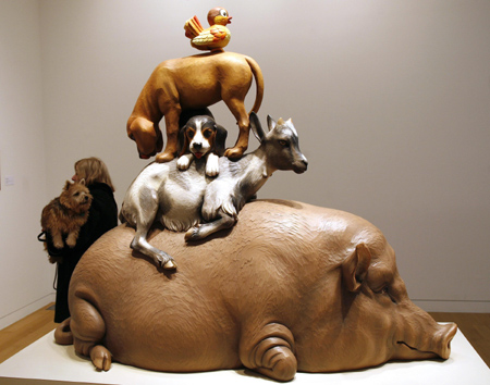 1月13日,美國藝術(shù)家杰夫·庫恩斯的彩色木雕作品“疊羅漢”在紐約索斯比拍賣行展出。這件彩色木雕作品將于2月5日拍賣,據(jù)估計將拍得340萬到490萬美元。
