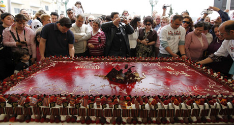 26日,在馬耳他的姆賈爾舉辦的2009年草莓節(jié)上,人們參觀一塊用草莓和巧克力制作的蛋糕。在一年一度的草莓節(jié)上,人們銷售新采摘的草莓和各種用草莓制作的食品,吸引了大量參觀者。新華社/路透