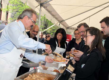 6日,在加拿大首都渥太華的國會山,加拿大農(nóng)業(yè)和糧食部長格里·里茨(左一)向加議員、政府工作人員派送豬肉漢堡,以向民眾展示食用豬肉是安全的。里茨當(dāng)天強調(diào)加拿大的豬肉及豬肉制品是安全的,呼吁公眾增加豬肉消費,以幫助拯救陷入困境的加拿大養(yǎng)豬業(yè)。上周,加拿大西部一豬場的豬身上檢測出甲型H1N1流感病毒,一些國家隨即宣布禁止進口加拿大豬肉,加豬肉出口已下跌10%-15%。