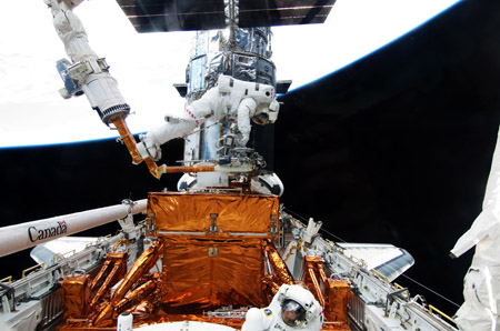 美國國家航空航天局5月18日發(fā)布的照片顯示,“阿特蘭蒂斯”號航天飛機(jī)宇航員邁克爾·馬西米諾和邁克爾·古德(左)在17日進(jìn)行的第四次太空行走中維護(hù)哈勃太空望遠(yuǎn)鏡。美國航天局18日發(fā)布消息說,“阿特蘭蒂斯”號航天飛機(jī)上的兩名宇航員安德魯·福伊斯特爾和約翰·格倫斯菲爾德當(dāng)天進(jìn)行太空行走為哈勃太空望遠(yuǎn)鏡更換了三塊電池、一個恒星追蹤傳感器以及熱屏蔽罩,完成了對哈勃的最后一次維護(hù)工作!鞍⑻靥m蒂斯”號航天飛機(jī)于11日發(fā)射升空,機(jī)上的7名宇航員通過5次太空行走對哈勃望遠(yuǎn)鏡進(jìn)行了最后一次維護(hù),為其更換了相機(jī)、電池、陀螺儀、對接環(huán)、光譜儀等設(shè)備。新華社/法新 |