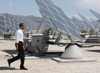 美國(guó)總統(tǒng)奧巴馬提出的經(jīng)濟(jì)刺激計(jì)劃中,首要的就是發(fā)展可再生能源。5月27日,美國(guó)總統(tǒng)奧巴馬在拉斯韋加斯的內(nèi)利斯空軍基地視察太陽(yáng)能電池板。新華社/路透 |