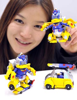 2月16日,在日本東京,一名模特展示TOMY玩具公司新推出的“機器人”版“唐老鴨”。這款玩具可以將一輛小汽車變形為踩著沖浪板的機器“唐老鴨”。新華社/法新 |