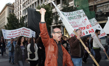 4月27日,在希臘首都雅典,希臘民眾示威抗議政府申請啟動(dòng)歐盟-IMF救助機(jī)制,反對采取更嚴(yán)厲的緊縮政策。新華社發(fā)(馬里奧斯·羅洛斯
