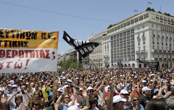 希臘兩大工會(huì)5月20日再次發(fā)起大罷工,這是今年希臘的第四次全國(guó)大罷工。繼續(xù)抗議政府增稅、削減工資和退休金的緊縮政策。希臘的危機(jī)并沒(méi)有過(guò)去。新華社發(fā) |