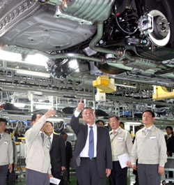 現(xiàn)代汽車總裁鄭夢九在視察現(xiàn)代汽車廠的生產(chǎn)車間