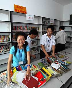 江西青春康源藥業(yè)有限公司的農(nóng)民工在閱覽室整理由新余市總工會捐贈的新書籍。本報記者 宋振平 攝 |