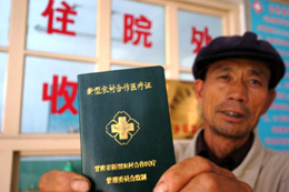 2007年,新型農(nóng)村合作醫(yī)療制度已經(jīng)覆蓋甘肅全省所有農(nóng)村人口,參合人數(shù)達到1780萬人。圖為甘肅省白銀市平川區(qū)水泉鎮(zhèn)下村農(nóng)民白江正在展示自家的“新型農(nóng)村合作醫(yī)療證”。新華社記者:張錳