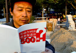 1月1日,來(lái)自四川渠縣的外來(lái)工肖光明在福州街頭工作休息時(shí)閱讀勞動(dòng)合同法的相關(guān)問(wèn)答。當(dāng)日,《中華人民共和國(guó)勞動(dòng)合同法》正式施行。