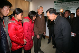 1月29日,溫家寶總理在湖南長沙看望在沙坪變電站除冰搶險中不幸殉職的周景華、羅長明、羅海文3名電力職工的家屬。溫家寶說:“今天面對你們,我無法用更多的語言來表示安慰,我給你們鞠個躬吧!”新華社記者:姚大偉