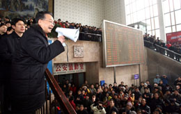 1月29日,溫家寶總理在湖南長沙火車站看望滯留車站的旅客。溫家寶對旅客說,春節(jié)快到了,我給大家拜個早年。你們被困在火車站,還沒能提早回家,我表示深深的歉意,現(xiàn)在我們正在想盡一切辦法搶修,一定把大家送回家過春節(jié)。新華社記者:姚大偉