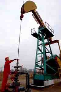 大慶油田第六采油廠的技術(shù)人員對抽油機進行巡檢。新華社記者:陳建力