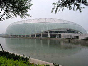 2008年北京奧運會計劃使用比賽場館37個,其中北京地區(qū)32個。天津奧林匹克中心體育場便是五個京外地區(qū)比賽場館之一,也是所有奧運會新建場館中最早建設(shè)的項目。在綠色奧運的理念指導(dǎo)下,天津奧林匹克中心體育場在建設(shè)中時刻把保護生態(tài)環(huán)境放在第一位。 由于天津奧林匹克中心體育場的外形酷似從天而降的一滴水,天津人形象地稱之為“水滴”。遠遠望去,陽光下的“水滴”明亮奪目,其銀色的“外衣”十分搶眼。據(jù)天津體育局副局長謝德龍介紹,“水滴”采用了聚碳酸酯板材智能化屋面系統(tǒng),具有很高的透光率及重量輕、抗沖擊、隔熱、防結(jié)露、節(jié)能等特點,與相同厚度的傳統(tǒng)板材相比,可節(jié)省25%的能源! 與其他體育場不同的是,“水滴”四面被一汪碧水所包圍,它的東、西、南、北方向是四個人工湖,湖上的四條坡道就像是四座人行天橋,有帶頂棚的長長走廊和連接地面的臺階,能將人們直接“輸送”到位于半空中的“水滴”觀光平臺。記者了解到,體育場在規(guī)劃之初,就本著因地制宜的宗旨,充分利用天津市區(qū)西南部地勢低洼的地形特點,進一步挖掘周圍洼地建成了這座“水中體育場”,這樣一來不僅可以提高水質(zhì)、減少建筑揚塵,還形成了獨特的水體景觀,體現(xiàn)了天津市依水而生的人文歷史和自然環(huán)境特征! 在臨近體育場活動區(qū)的一側(cè),為了方便管理和與建筑景觀相協(xié)調(diào),建筑師采用了人工駁岸,而在遠離體育場的一側(cè),為了保護水體和生物多樣性,這里選用了模仿自然駁岸的處理方法,水里還養(yǎng)殖了多種魚類,既凈化了水體,又充滿了生機和活力。 進入體育場,給記者的第一感覺是一片藍色,如果說“鳥巢”的中國紅帶給人熾烈、激動、振奮,而“水滴”帶給記者的則是安逸、平靜。在觀眾席上,六萬個以蔚藍色為主的坐椅,像海浪一樣環(huán)繞著整個場館。這象征著天津人的母親河——海河。
