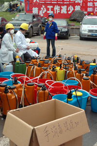 這是位于綿竹市東方汽輪機(jī)廠內(nèi)的消毒防疫點(diǎn)(5月15日攝)。 四川省綿竹市災(zāi)區(qū)為防止疫情爆發(fā),開始對居民聚集點(diǎn)等重點(diǎn)區(qū)域展開消毒和防疫工作。新華社記者:苑堅(jiān)