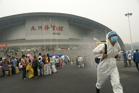 | 綿陽的九洲體育館是當(dāng)?shù)刈畲蟮陌仓脼?zāi)民的營地。5月24日,一名防疫人員在此進(jìn)行消毒作業(yè)。新華社發(fā)(鄭宇鈞