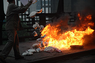 6月22日,重慶鋼鐵廠的工人將毒品倒入焚燒爐入口。這是重慶首次以環(huán)保方式焚燒毒品。 與過去露天公開焚燒毒品的方式相比,采用鋼鐵廠的焚燒爐焚燒毒品,所排出的煙氣和粉塵不含毒品成分,符合焚燒爐排放標(biāo)準(zhǔn),最大限度降低了對(duì)環(huán)境的影響。新華社記者