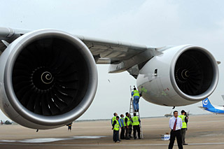 | 被譽(yù)為“空中巨無霸”的空客A380型客機(jī)在珠海機(jī)場(chǎng)參加今年的第七屆珠海航展。新華社記者 周文杰