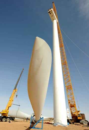 圖為施工人員正在內(nèi)蒙古巴彥淖爾市烏拉特后旗烏力吉風(fēng)電場吊裝風(fēng)機(jī)。到2010年,內(nèi)蒙古風(fēng)電裝機(jī)容量將達(dá)到500萬千瓦以上。本報記者:張領(lǐng)