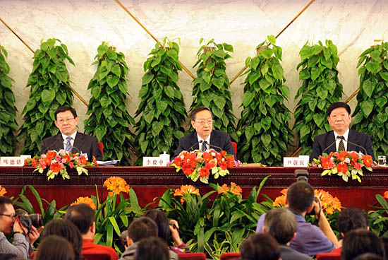 | 3月10日,十一屆全國(guó)人大二次會(huì)議舉行記者會(huì),工業(yè)和信息化部部長(zhǎng)李毅中、人力資源和社會(huì)保障部部長(zhǎng)尹蔚民、商務(wù)部部長(zhǎng)陳德銘答記者問。新華社記者
