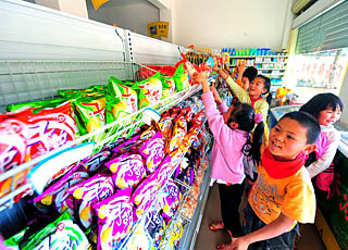 | 3月11日,大密羅村的幾名小學(xué)生在村中“小超市”購(gòu)買小食品。云南省玉溪市供銷系統(tǒng)所屬百信商貿(mào)集團(tuán),從2008年開(kāi)始,補(bǔ)貼相關(guān)費(fèi)用在該市農(nóng)村建立村級(jí)“小超市”!靶〕小辈扇〗y(tǒng)一價(jià)格、統(tǒng)一標(biāo)識(shí)、統(tǒng)一物流配送及售賣方式,按批發(fā)價(jià)向村民零售貨物,農(nóng)民足不出村,即可買到實(shí)惠的日常用品。目前,這種鄉(xiāng)村“小超市”已經(jīng)覆蓋了玉溪市約25萬(wàn)農(nóng)村消費(fèi)人群。新華社記者