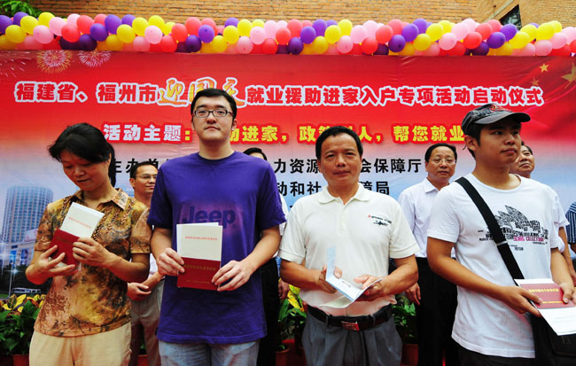 9月14日,福建省、市、區(qū)領導為就業(yè)困難人員發(fā)放福建省第一批《就業(yè)失業(yè)登記證》及政策宣傳手冊。當日,“福建省、市2009年迎國慶就業(yè)援助進家入戶專項活動”在福州市中山社區(qū)舉辦啟動儀式。福州市四城區(qū)公共就業(yè)服務機構及其42街道(鄉(xiāng)鎮(zhèn))297個社區(qū)勞動保障機構代表400多人參加啟動儀式。據(jù)了解,就業(yè)援助、進家入戶專項活動主題為:援助進家,政策到人,幫您就業(yè);顒訛槠诎雮月。 |