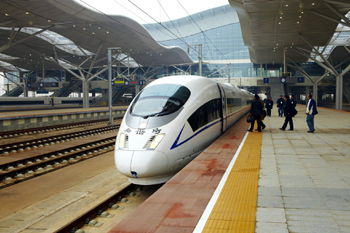 “和諧號(hào)”動(dòng)車組列車?吭谖鋸V鐵路客運(yùn)專線長(zhǎng)沙南站站臺(tái)。新華社發(fā)(高錦旭/攝) |