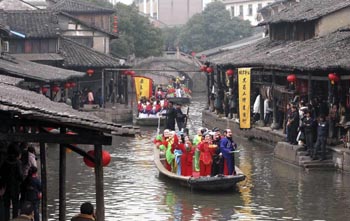 1月1日,演員在浙江紹興的安昌古鎮(zhèn)向游客賀新年。當日,浙江省紹興縣的安昌古鎮(zhèn)舉辦風情節(jié),展示紹興水鄉(xiāng)的傳統(tǒng)民俗,迎接新年。新華社發(fā) 袁云/攝
