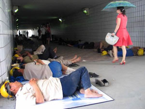 建成了城市許多高樓的農(nóng)民工,常常是鋪蓋往地上一擱就“住下了”。 |