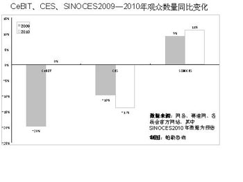 全球電子展覽業(yè)重心正在由美歐國家向中國轉(zhuǎn)移。有關(guān)數(shù)據(jù)顯示,美歐兩大電子展會(huì)CES(美國拉斯維加斯國際消費(fèi)電子產(chǎn)品展)、CeBIT(德國漢諾威國際信息及通信技術(shù)博覽會(huì))已經(jīng)連續(xù)多年縮水,而在一系列擴(kuò)大內(nèi)需的政策刺激下,中國電子產(chǎn)品市場(chǎng)高速發(fā)展,中國的消費(fèi)電子展SINOCES(青島中國國際消費(fèi)電子博覽會(huì))卻連年增長。