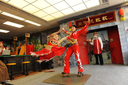 ——“向傳統(tǒng)致敬”集合在一起。一場傳統(tǒng)與創(chuàng)新的主題派對日前在肯德基北京前門餐廳舉行。 記者在活動現(xiàn)場看到,“肯德基爺爺”手里拿的,正是中國人喜聞樂見的經(jīng)典美食——油條豆?jié){。洋快餐賣起了豆?jié){油條,三字經(jīng)混搭現(xiàn)代歌舞、雜技玩起了滾軸、變臉變出奧巴馬和肯德基爺爺……在傳統(tǒng)演出中加以創(chuàng)新元素,在場觀眾在重溫經(jīng)典中感受到了新鮮和樂趣。 傳統(tǒng)與創(chuàng)新融合,更具生命力?系禄谶B續(xù)推出的醇豆?jié){和霜糖油條兩款中式產(chǎn)品,目前醇豆?jié){產(chǎn)品成功入主肯德基常規(guī)菜單。新推出的“霜糖油條”在向傳統(tǒng)致敬的基礎(chǔ)上,又大膽創(chuàng)新突破,金黃色的油條批上了一層雪白的糖霜,既借鑒了中國的傳統(tǒng)美食,又融合了其他國家午后甜點的“洋”味道。 從老北京雞肉卷到燒餅米飯,再到豆?jié){油條,中國最傳統(tǒng)的美食飲品被洋快餐陸續(xù)擺上餐桌。專家指出,對于洋快餐來說,“向傳統(tǒng)致敬”既是一個向中國消費者示好的方式,更意味著他們看好傳統(tǒng)中國美食的較大市場空間。