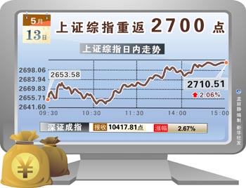5月13日,受央行在公開市場投放資金、主板市場暫停新股發(fā)行傳聞以及美國道指收復上周全部跌幅等利好消息的影響和提振,A股市場終于迎來技術反彈。其中,滬指在時隔18個交易日后重新登上5日線,并且重新站上2700點整數(shù)關口,市場重心有所上移。 統(tǒng)計數(shù)據(jù)顯示,當日滬綜指開于2653.58點,最高2711.07點,最低2646.90點,收于2710.51點,漲54.79點,漲幅2.06%,成交額907.36億元;深成指開盤10161.18點,最高10417.81點,最低10114.68點,收于10417.81點,漲271.17點,漲幅2.67%,成交額633.24億元。 從盤面看,石化雙雄、銀行、有色金屬等權重板塊的集體拉抬為大盤重新企穩(wěn)奠定了基礎,再加之智能電網(wǎng)、西藏、新材料、低碳、醫(yī)藥等中小盤股集中的眾多板塊也相繼企穩(wěn),市場做多熱情重燃。 其中,銀行股活躍,深發(fā)展A、交通銀行、中國銀行、工商銀行等銀行股大幅上漲,帶動金融板塊全線飄紅。煤炭板塊強勁上揚,國投新集領漲,高開高走漲逾7%,西山煤電、潞安環(huán)能、國際實業(yè)、上海能源、平煤股份等漲逾5%。有色金屬板塊午后崛起,西藏礦業(yè)、包鋼稀土、章源鎢業(yè)漲停,中孚實業(yè)、廈門鎢業(yè)、貴研鉑業(yè)、東方鉭業(yè)、寶鈦股份等漲逾6%;w板塊強勢,華峰氨綸漲停,華西村、海利得、煙臺氨綸、澳洋科技等漲逾6%。截至收盤,化纖板塊漲4.04%,位于漲幅榜第一。 中國人民銀行當天發(fā)行了200億元3個月期央票,并進行了300億元的91天期正回購操作;加上本周二發(fā)行了140億元1年期央票,使得本周公開市場合計回籠資金僅為640億元。同時,由于本周到期釋放資金量高達2160億元,這就意味著本周凈投放資金規(guī)模達到1520億元,結束了連續(xù)11周以來的資金凈回籠格局。 當天還有傳聞稱,由于新股頻頻破發(fā),使得管理層有暫緩主板新股發(fā)行的意圖。對此,世基投資認為,其實結合2008年熊市管理層對市場公開操作來看,停發(fā)新股IPO的可能性是很大的。特別是在目前歐美重陷債務危機,我國經(jīng)濟有面臨二次探底可能的關鍵時候,資本市場的穩(wěn)定尤為重要。 在周四發(fā)布的報告中,中金公司明確表示,權重股表現(xiàn)較好不代表利空已消化完畢,前期強勢個股顯示補跌的跡象,當前保持低倉位仍然是好的投資策略。中金公司認為,弱市中不存在持續(xù)的防御性板塊,以醫(yī)藥板塊為例,此輪調整以來醫(yī)藥板塊表現(xiàn)明顯好于大盤,但目前醫(yī)藥股相對于大盤的估值溢價已經(jīng)非常高,在股指持續(xù)下跌的情況下,醫(yī)藥股同樣存在補跌的壓力。 愛建證券分析師袁俊認為,從技術指標看,滬指只要不跌破2673點則意味著從3157點開始的下跌暫告一段落,后市個股將呈現(xiàn)分化走勢。但是要提醒的是中小板的部分公司大小非即將開始流通,建議投資者密切關注相關大小非的動向,畢竟以后大小非對于股票的波動會有較大的影響。 根據(jù)平安證券策略分析師蔡大貴的判斷,上證指數(shù)在2600點左右形成了較強的支撐,具備反彈基礎。反彈的空間不會很大,估計在10%左右,可能是以較為反復的形式進行。新興產(chǎn)業(yè)等中小市值概念股仍是市場關注焦點,目前市場還不具有推升大盤權重股的條件。