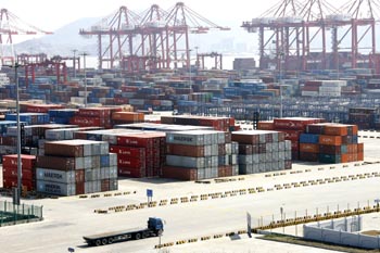 上海洋山深水港碼頭集裝箱堆場(chǎng)上的載貨集裝箱等待轉(zhuǎn)運(yùn)。上海海關(guān)近日發(fā)布的上海外貿(mào)進(jìn)出口數(shù)據(jù)顯示,2010年前4個(gè)月上海關(guān)區(qū)累計(jì)實(shí)現(xiàn)進(jìn)出口總額2002.2億美元,同比增長(zhǎng)38.1%。新華社記者
