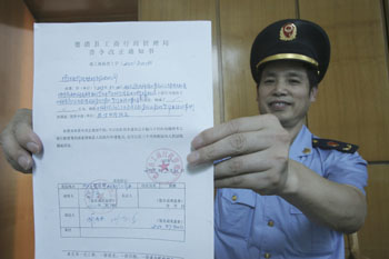 7月20日,在德清縣俞氏塑料制品有限公司,德清縣工商局執(zhí)法人員展示依據(jù)《網(wǎng)絡(luò)商品交易及有關(guān)服務(wù)行為管理暫行辦法》發(fā)出的《責(zé)令改正通知書》。新華社發(fā) |