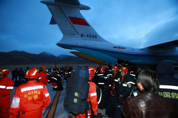 中國國際救援隊(duì)搭乘空軍運(yùn)輸機(jī)抵達(dá)青海玉樹。新華社發(fā) |