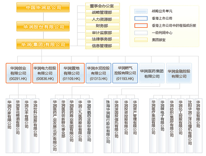 | 華潤前身是1938年中共為抗日戰(zhàn)爭在香港建立的地下交通站。1948年改組更名為華潤公司,1952年隸屬關(guān)系由中共中央辦公廳變?yōu)橹醒胭Q(mào)易部(現(xiàn)為商務(wù)部)。1983年改組成立華潤(集團(tuán))有限公司。1999年12月,與外經(jīng)貿(mào)部脫鉤,列為中央管理。2003年歸屬國務(wù)院國有資產(chǎn)監(jiān)督管理委員會領(lǐng)導(dǎo)下的中央企業(yè)。主營業(yè)務(wù)包括日用消費(fèi)品制造與分銷、地產(chǎn)及相關(guān)行業(yè)、基礎(chǔ)設(shè)施及公用事業(yè)三塊領(lǐng)域,旗下共有20家一級利潤中心,在香港擁有5家上市公司:華潤創(chuàng)業(yè)(HK291)、華潤電力(HK836)、華潤置地(HK1109)、華潤水泥(HK1313)和華潤燃?xì)猓℉K1193)。2013年7月8日,《財富》雜志發(fā)布的世界500強(qiáng)排行榜,華潤集團(tuán)名列187位,首次進(jìn)入200強(qiáng),排名上升46位。 |
