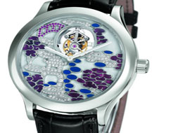 梵克雅寶午夜東方花園陀飛輪鉑金腕表在珍貴寶石的烘托下,面盤上恬靜神秘的東方園林通過兩種琺瑯技法呼之欲出。蛋面磨光琺瑯和大明火琺瑯相輔相成,勾繪出東方園林的迷人神韻,m瑯技藝要求超高的溫度和卓越的工藝。這款限量版鉑金腕表搭配鱷魚皮表帶,僅售8枚。表殼:鉑金材質(zhì),圓形表殼,藍寶石水晶底蓋,可顯示機芯運轉。表盤:大明火和蛋面磨光琺瑯,鑲嵌鉆石、藍寶石,棒形指針,不設時間刻度。