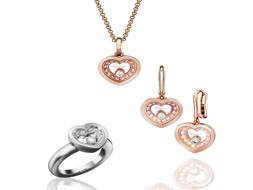 Chopard系列的耳環(huán)和項(xiàng)鏈采用18k玫瑰金材質(zhì),鉆石的光芒不但環(huán)繞永恒的心形設(shè)計(jì),更浮動(dòng)于“心”中,璀璨耀眼,中心配上一顆令人驚艷的活動(dòng)鉆石。