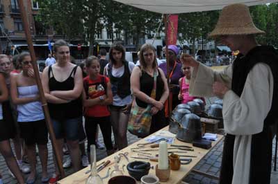6月30日,一些學生在比利時首都布魯塞爾街頭觀看古代郎中和他的器具。當天,布魯塞爾情景再現歐洲中世紀的世俗生活,以獨特方式慶祝比利時即將擔任歐盟輪值主席,并迎接暑假的到來。