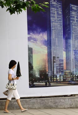 7月11日,一位女士從市中心的一處樓盤(pán)促銷(xiāo)廣告牌前經(jīng)過(guò)!∵M(jìn)入6月,大連樓市多個(gè)樓盤(pán)出現(xiàn)“個(gè)位數(shù)成交”,部分地產(chǎn)項(xiàng)目陸續(xù)推出了全款打折優(yōu)惠。新華社記者