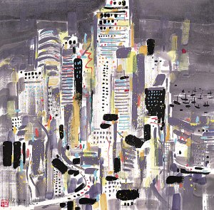 吳冠中借喻了魯迅筆下的“小樓”,表述的是自己躲進(jìn)藝術(shù)殿堂,走南闖北,東尋西找,上下求索的境懷;以及越過傳統(tǒng)筆墨、傳統(tǒng)圖式,不為外界左右的藝術(shù)激情!包c(diǎn)、線、面,黑、白、灰,加自家色彩”是吳冠中藝術(shù)形式的七要素。在這幅畫中,作者將這些要素充分展示給了觀眾。另一幅作品《香港夜景》是吳冠中受香港土地發(fā)展公司邀請(qǐng),專程在香港停留一個(gè)月而創(chuàng)作出的嘗試性作品之一。畫面無處不涌動(dòng)著作者的創(chuàng)作激情,其大膽的跳過線的點(diǎn)與面的結(jié)合,加上豐富色彩的綜合運(yùn)用,將香港之夜表現(xiàn)得熱鬧而又神秘。吳冠中曾多次撰文提到這次香港創(chuàng)作之旅:“我確乎愛那些古老市街的風(fēng)采,那是我青少年時(shí)代所熟悉的祖國鬧市,我曾在其間逛游,當(dāng)時(shí)只是觀光,無錢購物,今日坐在香港街頭寫生,筆底卻流露出童年的憧憬來!